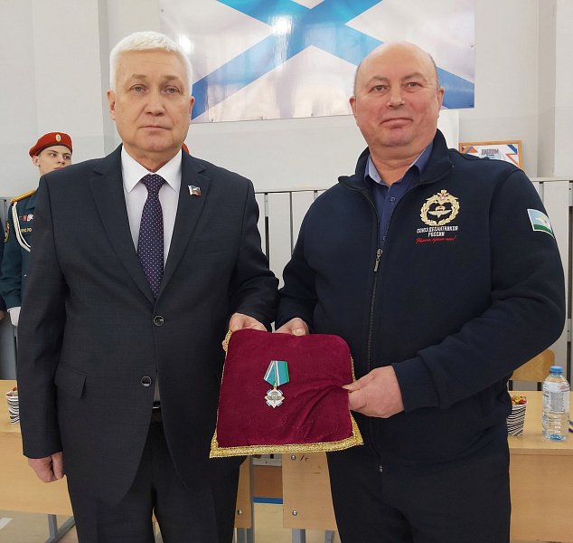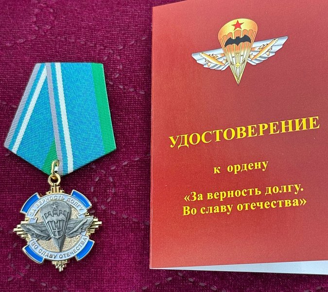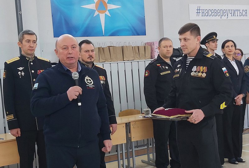 Всероссийский Союз общественных объединений ветеранов десантных войск "Союз десантников России" за многолетний вклад в патриотическое воспитание юных мурманчан наградил школу орденом "За верность долгу во славу Отечества". Орден вручил и прикрепил к флагу Кадетской школы ветеран десантных войск Василий Анатольевич Буров.