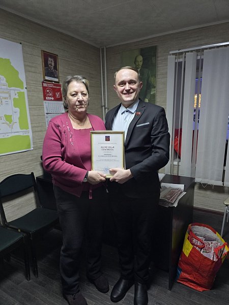 4 марта 2026 года депутат Мурманской областной Думы Александр Викторович Клементьев вручил Почетную грамоту Мурманской областной Думы за многолетний добросовестный труд и активную общественно-политическую деятельность ковдорчанке Зинченко Надежде Валентиновне.
