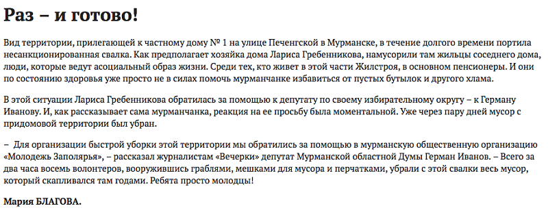 В редакцию газеты "Вечерний Мурманск" поступило обращение мурманчанки, которая выразила благодарность депутату Герману Иванову.