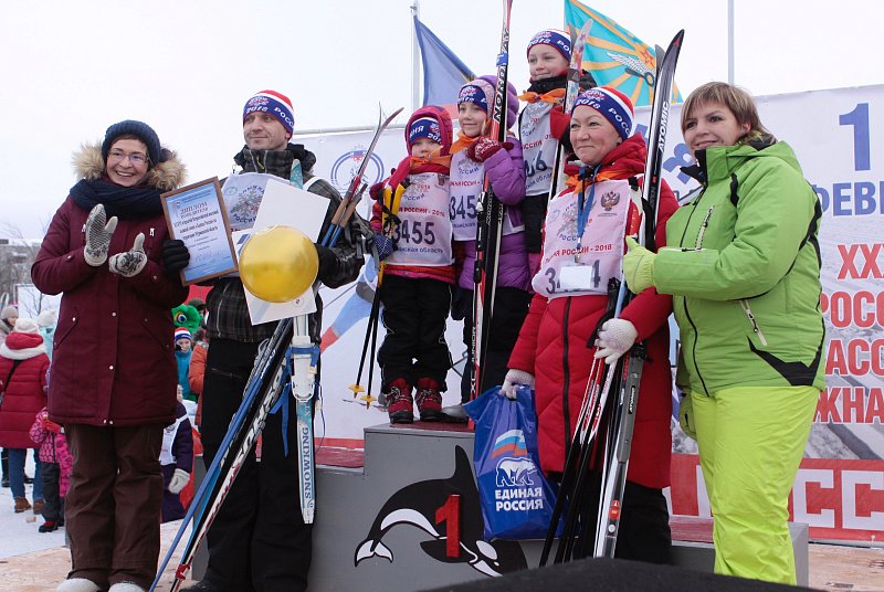 В этом году в Мурманской области центральный старт "Лыжни России" был дан в гарнизоне Североморск-3. На трассу вышли более тысячи спортсменов самого разного возраста. Призы были разыграны в четырех возрастных группах на дистанциях до 10 км. Лариса Круглова вручила награду самой спортивной семье.