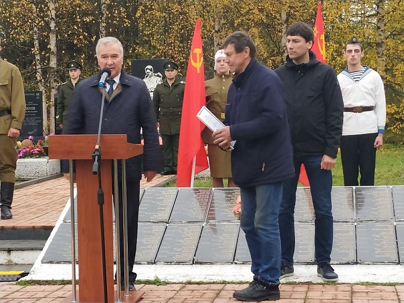 От имени Мурманской областной Думы Василий Омельчук вручил благодарственные письма руководителям военно-патриотических организаций "Поиск" и "Верман" Юрию Зиновьеву и Андрею Сизову. Парламентарий поблагодарил поисковиков и их единомышленников за большой вклад в работу по увековечиванию подвига защитников Отечества в годы советско-финляндской и Великой Отечественной войны.