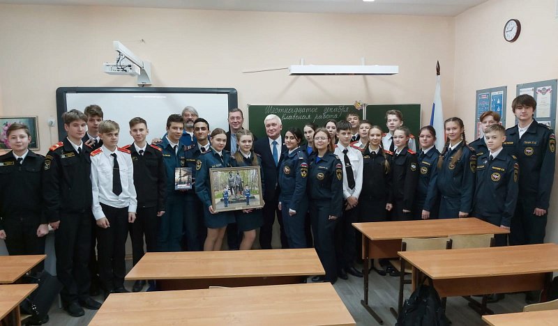 Встреча состоялась в канун новогодних каникул, в качестве новогоднего подарка вручил школе книгу "Фронт без линии фронта", подписанную председателем общества "Щит", генералом-майором Гурылевым Геннадием Александровичем и передал в дар картину, изображающую народный памятник воинам Полярной дивизии в знак признательности большой работы по патриотическому воспитанию в школе.