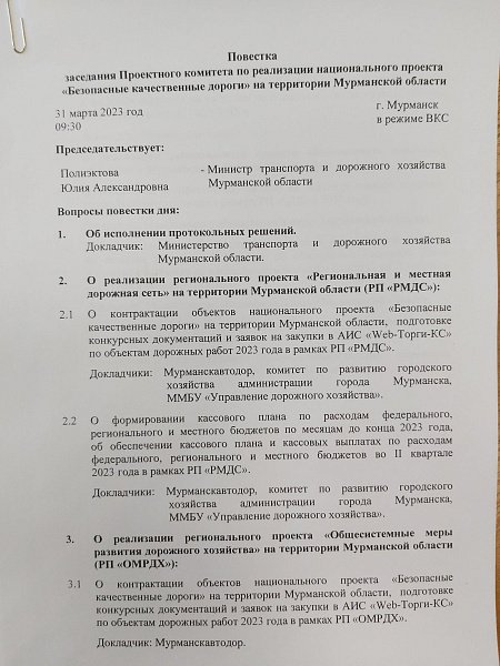 31 марта участники Проектного комитета обсудили исполнение протокольных решений, реализацию регионального проекта "Региональная и местная дорожная сеть" на территории Мурманской области, работу проекта "Общесистемные меры развития дорожного хозяйства" на территории нашего региона и исполнение проекта "Безопасность дорожного движения в Мурманской области".