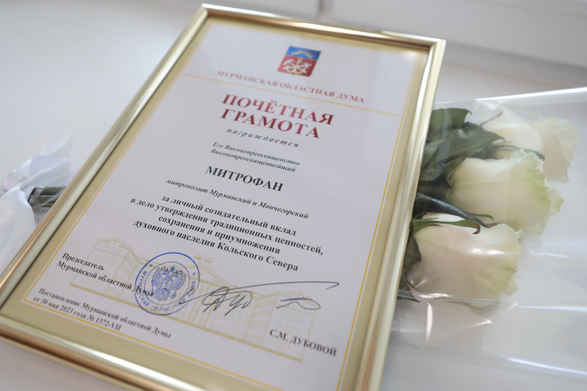 Спикер вручил Владыке Почетную грамоту Мурманской областной Думы за личный созидательный вклад в дело утверждения традиционных ценностей, сохранения и приумножения духовного наследия Кольского Севера, пожелал крепости сил и успехов в добрых делах.
