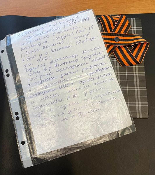 Обратилась с просьбой оказать содействие в увековечении памяти о ее папе Александре Михайловиче Карагаеве. Речь шла о доставке земли, изъятой с места рождения героя, для ее доставки и торжественного захоронения на острове Диксон.