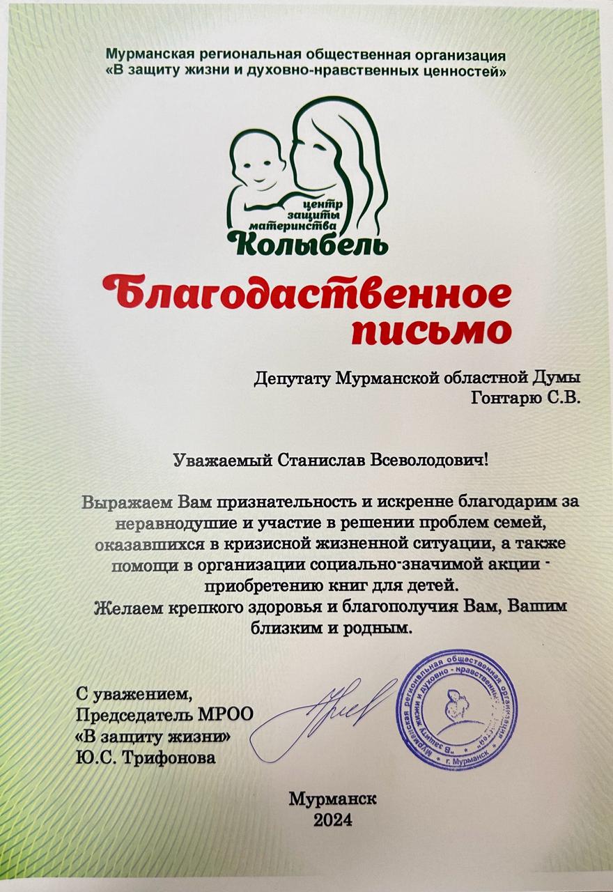 Председатель Центра защиты материнства «Колыбель» Юлия Трифонова вручила благодарственные письма от организации Станиславу Гонтарь, депутату Мурманской областной Думы от ЛДПР, а также представителям Мурманского регионального отделения ЛДПР - Владиславу Ефимовичу, Яне Безделевой и Валерию Лебедеву. Юлия Трифонова поблагодарила ЛДПР за помощь в акции по сбору детских книг, а также за активное участие в деятельности и помощь их организации.