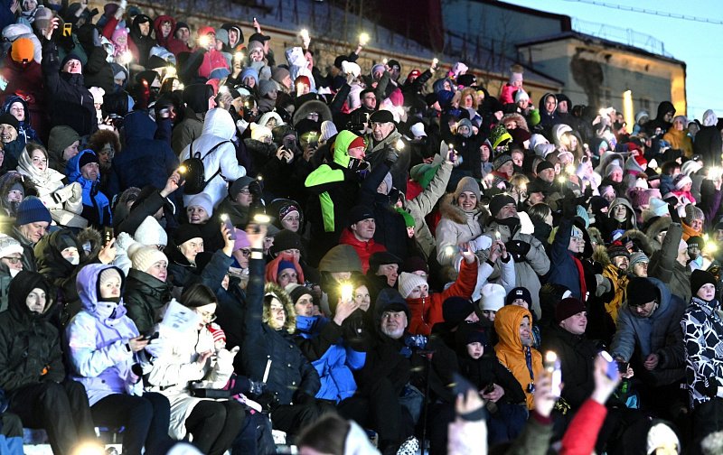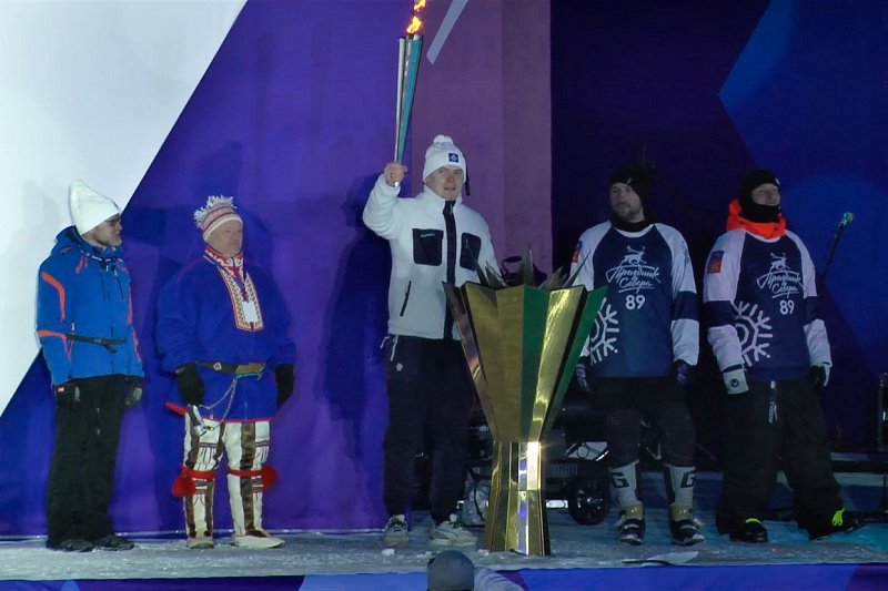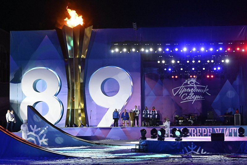 После официального старта и церемонии зажжения огня Полярной Олимпиады на Центральном стадионе развернулось масштабное шоу, на котором выступили мотофристайлеры, спортсмены на снегоходах, горных лыжах и сноубордах.
