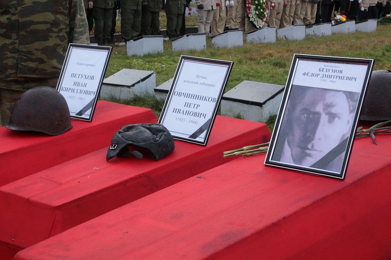 На территории мемориального комплекса были преданы земле останки 87 солдат, которые обнаружили в этом году в ходе летнего поискового сезона. Удалось установить имена лишь трех защитников Заполярья. Родные одного из них, красноармейца Безумова Федора Дмитриевича, были приглашены на церемонию захоронения.
